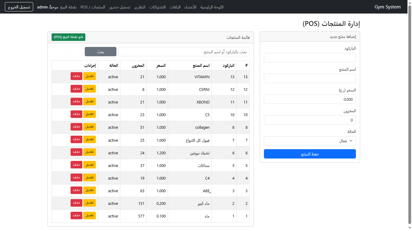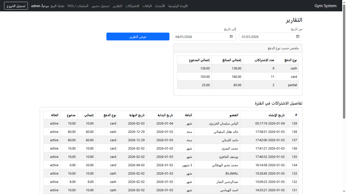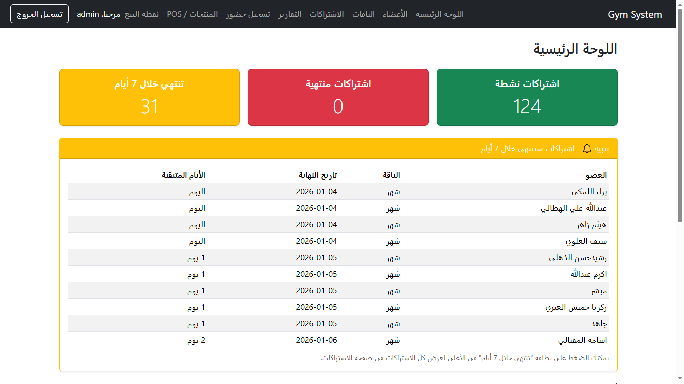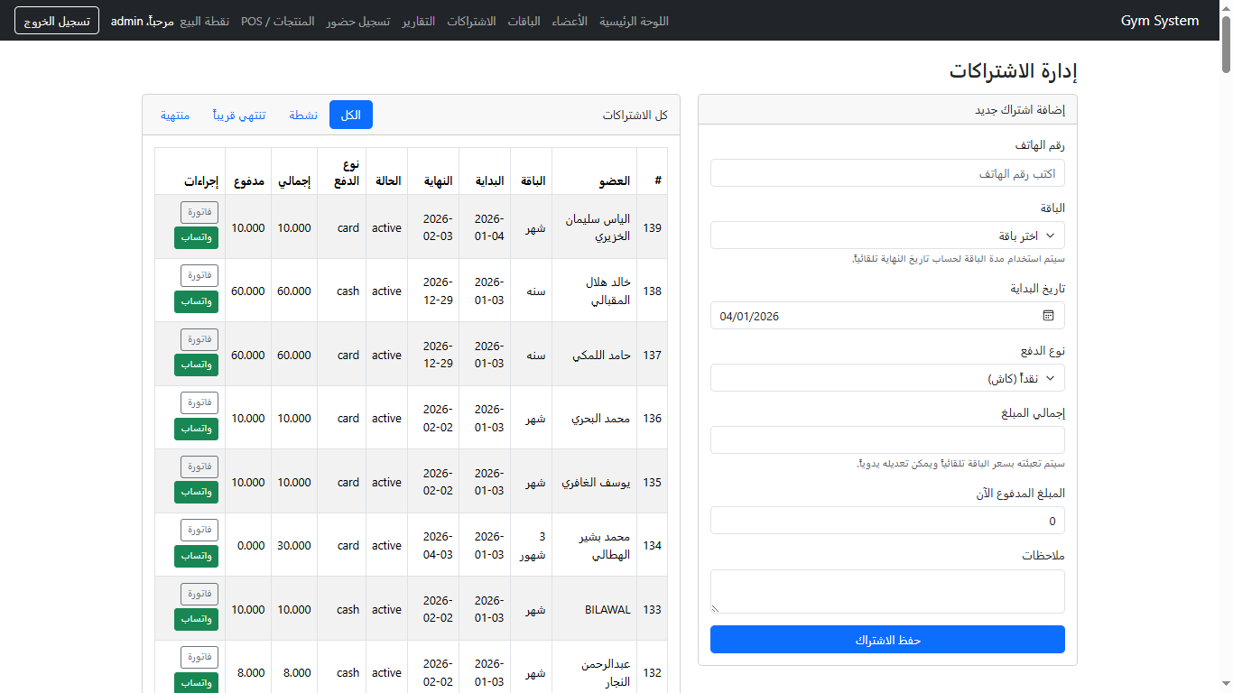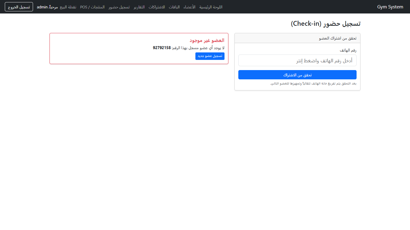 نظام عربي (RTL) مخصص للصالات الرياضية لإدارة الأعضاء، الباقات، الاشتراكات، تسجيل الحضور (Check-in)، التقارير المالية، ونقطة البيع للمنتجات — بواجهة سهلة وسريعة.