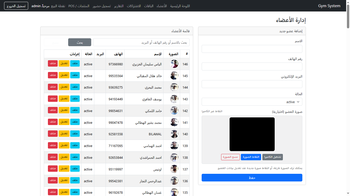 تسجيل الأعضاء، البحث السريع، تحديث البيانات، والتقاط صورة العضو مباشرة بالكاميرا.